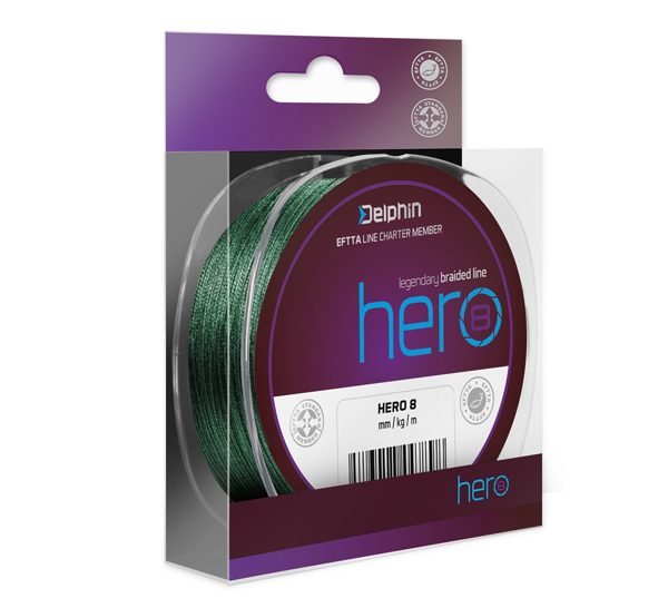 Delphin HERO 8 este un şnur fiabil, împletit din 8 microfibre PE. Prin împletirea sistematică a fibrelor se obţine o portanţă excelentă a şnurului, o alungire aproape nulă şi o suprafaţă mult mai fină comparativ cu şnururile din 4 fibre. Astfel tragerea se transmite instantaneu de la momeală la lansetă, ceea ce permite o reacţie mult mai rapidă decât la fir. În plus, datorită suprafeţei mai netede este mult mai menajant faţă de inelele lansetei decât şnururile cu patru fibre. HERO 8 este finisat la suprafaţă, prin care este eliminată absorbanţa sa. Datorită scalei largi a diametrelor şi portanţelor oferite, Delphin HERO 8 este foarte adecvat pentru utilizarea la majoritatea tehnicilor de pescuit!